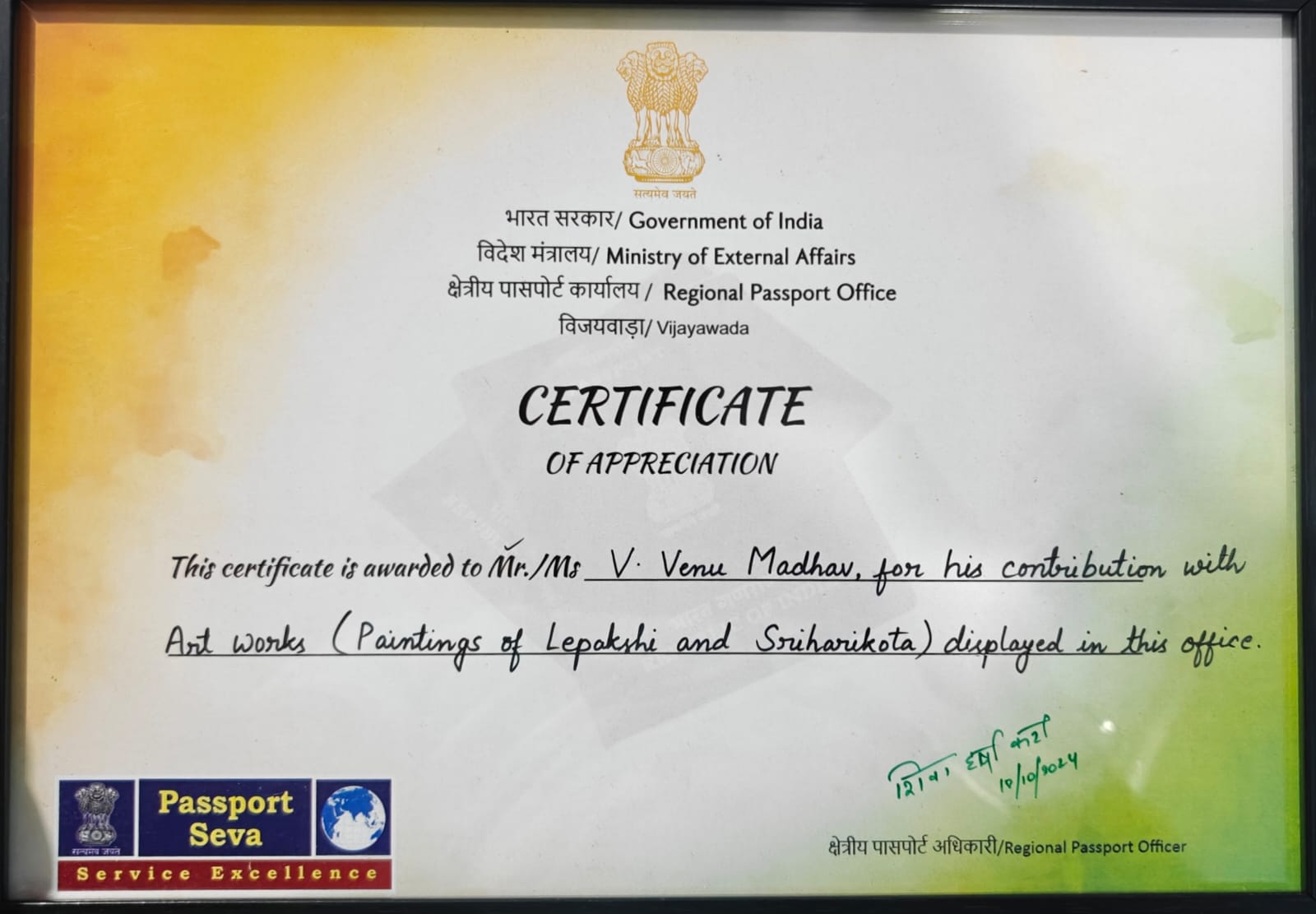 Certificate from RPO Vijayawada for the Art Projects done for them – Oct 2024
